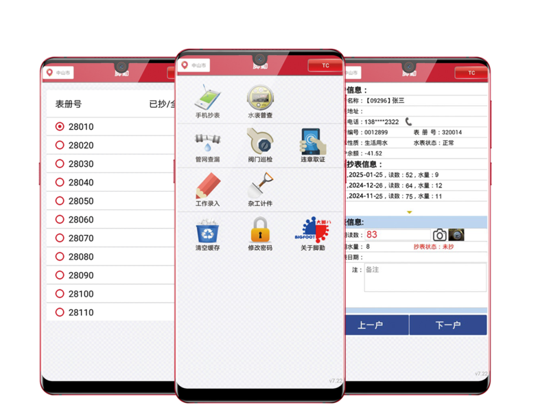 手機拍照抄表系統無需另外購買抄表硬件,抄表人員使用自己的安卓智能手機便可以輕松開始抄表,告別了傳統笨重的紙質表冊,降低了水司購買抄表機的前期投入和維護成本,為抄表帶來了最大限度樣的便捷。結合讀數識別等黑科技,將抄表變得無比輕松。配合藍牙打印機設備可以抄表現場打印水費通知單,簡化抄表催收環節的工作量,為全面提升抄表管理水平。